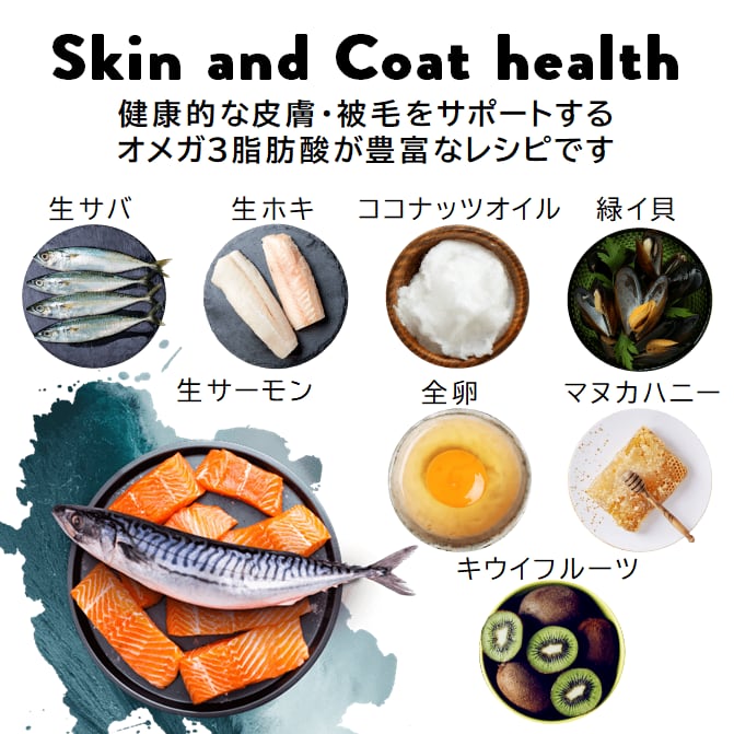 太平洋回遊の生キングサーモンをベースに、生サバ、生ホキ、ココナッツオイル等を配合し、健康的な皮膚・被毛をサポートするオメガ3、6脂肪酸が豊富なフードです。