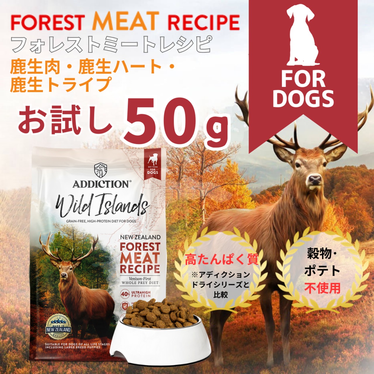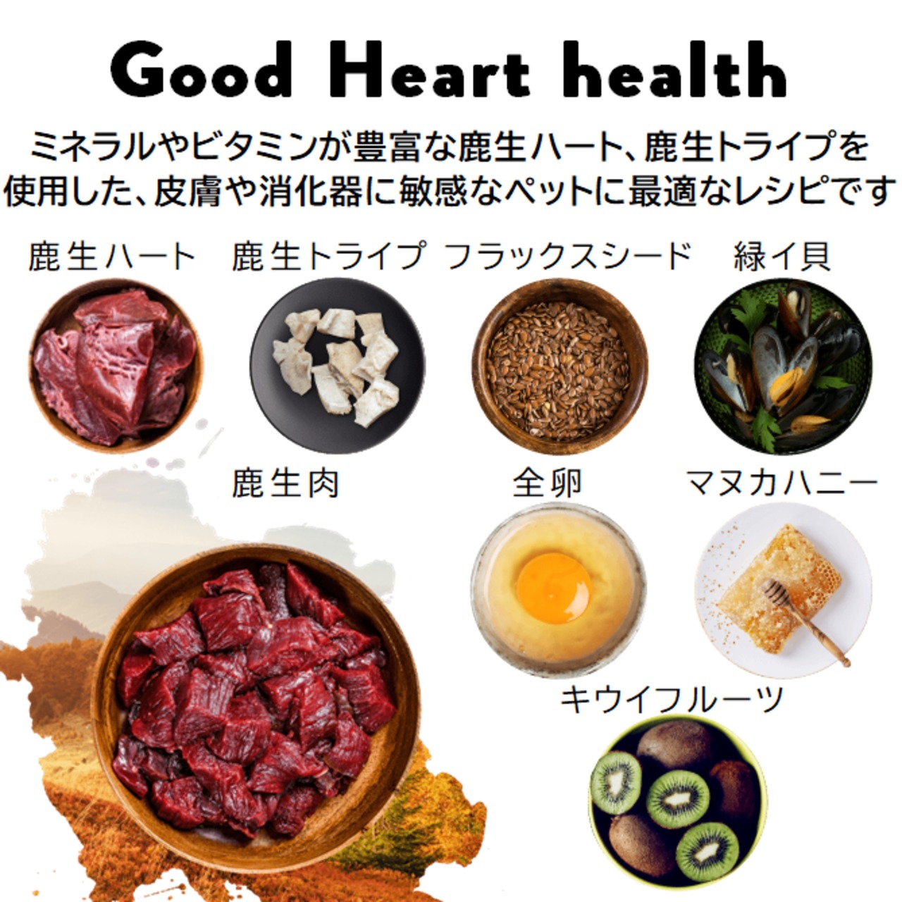 ニュージーランド産フリーレンジ(放飼い)鹿生肉、ミネラルやビタミンが豊富な鹿生ハート、鹿生トライプを使用した、皮膚や消化器に敏感なペットに最適なレシピです。