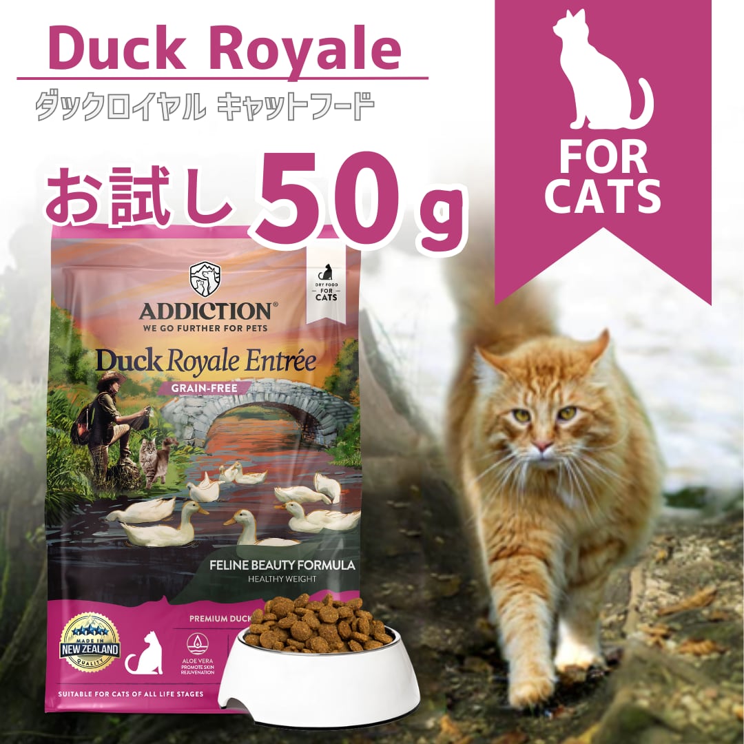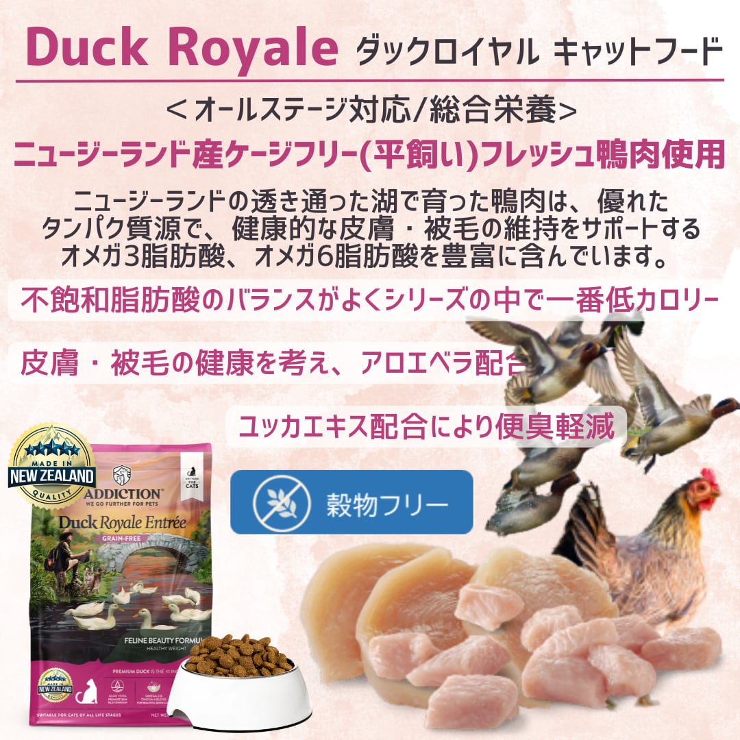 鴨生肉、鶏生肉、ドライ鶏肉、そら豆、タピオカ、エンドウ豆、ポテト、鶏脂肪、フラックスシード、ナチュラルフレーバー、フィッシュミール、ビール酵母、全卵、フィッシュオイル、ビネガー、イヌリン、アロエベラ、ユッカエキス、塩、塩化カリウム、塩化コリン、タウリン、DL-メチオニン、亜鉛アミノ酸複合体、鉄アミノ酸複合体、炭酸カルシウム、ナイアシン、ビタミンE、銅アミノ酸複合体、マンガンアミノ酸複合体、硝酸チアミン、d-パントテン酸カルシウム、亜セレン酸ナトリウム、リボフラビン、塩酸ピリドキシン、ビタミンA、ビオチン、ビタミンC、ビタミンB12、硫酸コバルト、葉酸、ヨウ素酸カルシウム、ビタミンK1、ビタミンD3、ローズマリーエキス、緑茶エキス、スペアミントエキス、酸化防止剤(ミックストコフェロール)
