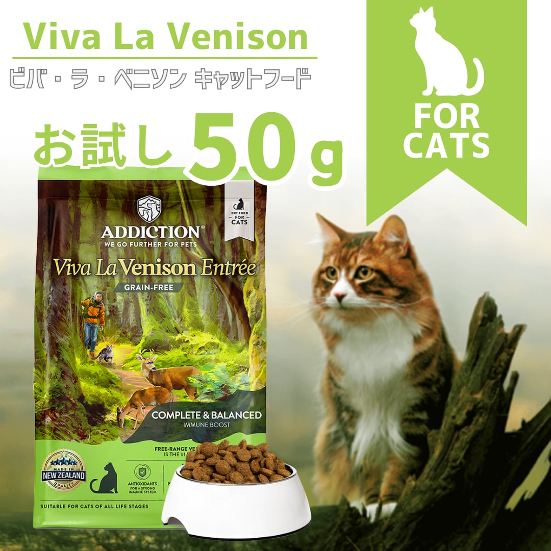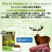 鹿生肉、鶏生肉、ドライ鶏肉、そら豆、タピオカ、鶏脂肪、エンドウ豆、ポテト、フラックスシード、ナチュラルフレーバー、ビール酵母、全卵、ビネガー、ドライケルプ、イヌリン、ターメリック、クローブ、グレープフルーツ、塩、硫酸マグネシウム、塩化コリン、タウリン、DL-メチオニン、亜鉛アミノ酸複合体、鉄アミノ酸複合体、炭酸カルシウム、ナイアシン、ビタミンE、銅アミノ酸複合体、マンガンアミノ酸複合体、硝酸チアミン、d-パントテン酸カルシウム、亜セレン酸ナトリウム、リボフラビン、塩酸ピリドキシン、ビタミンA、ビオチン、ビタミンC、ビタミンB12、硫酸コバルト、葉酸、ヨウ素酸カルシウム、ビタミンK1、ビタミンD3、ローズマリーエキス、緑茶エキス、スペアミントエキス、酸化防止剤(ミックストコフェロール)