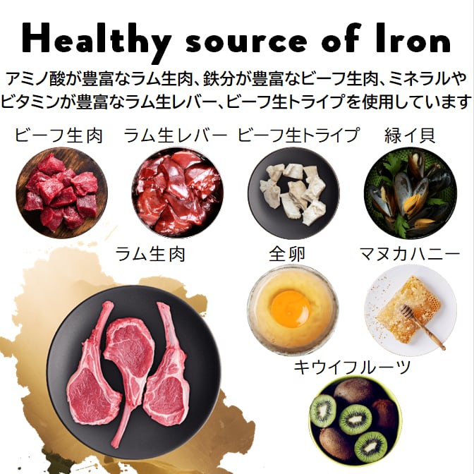 アミノ酸が豊富なグラスフェッドラム生肉と、鉄分が豊富なグラスフェッドビーフ生肉を使用し、ミネラルやビタミンが豊富なラム生レバー、ビーフ生トライプを加えました。