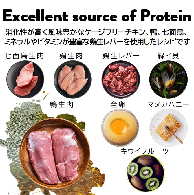消化性が高く風味豊かなケージフリーチキン・鴨・七面鳥、ミネラルやビタミンが豊富な鶏生レバーを使用し、丈夫な身体形成をサポートします。
