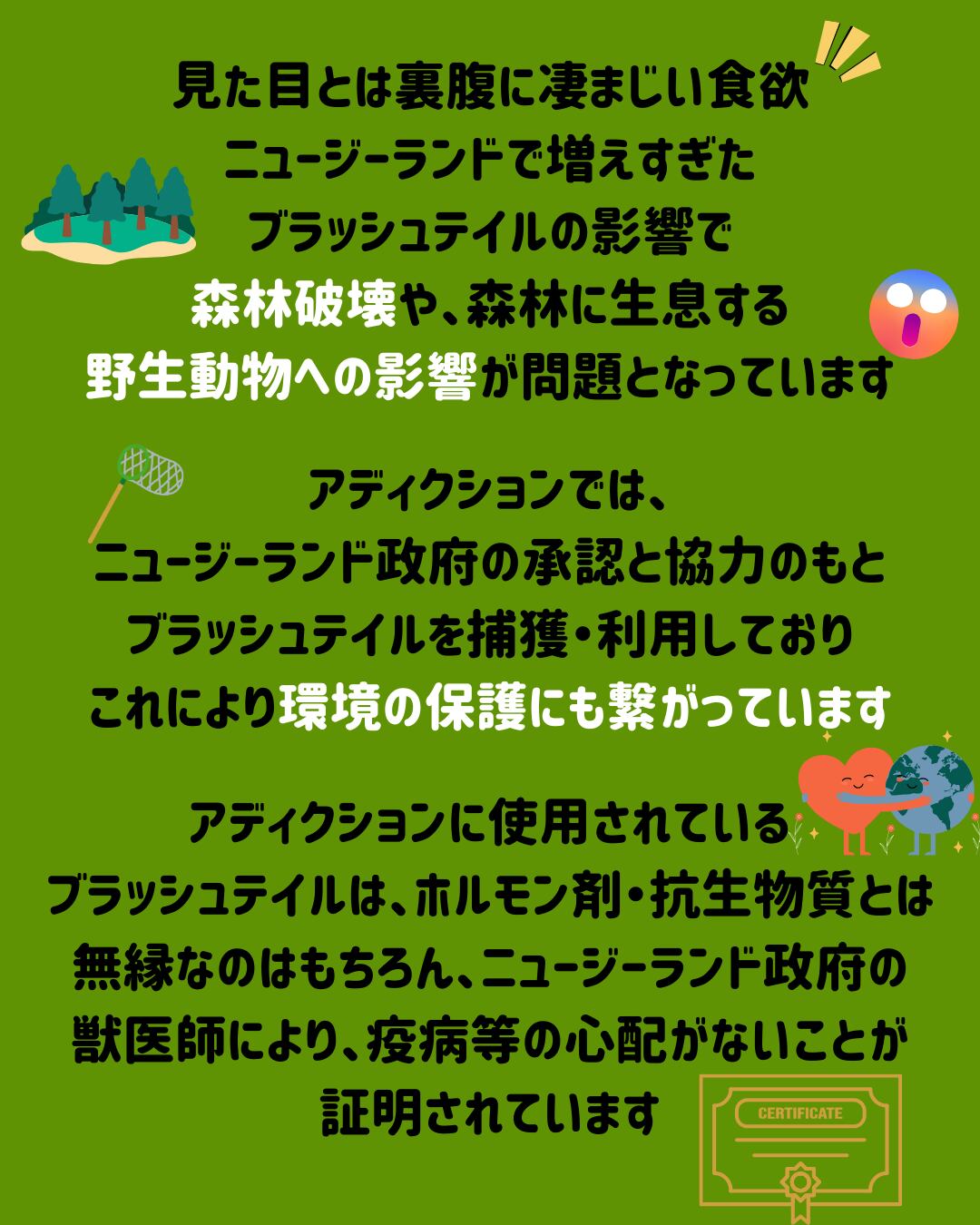 ※着色料、発色剤、人工保存料を使用していないため、フードの色、におい、形状は、製造の季節や時期によりバラつきがあります。