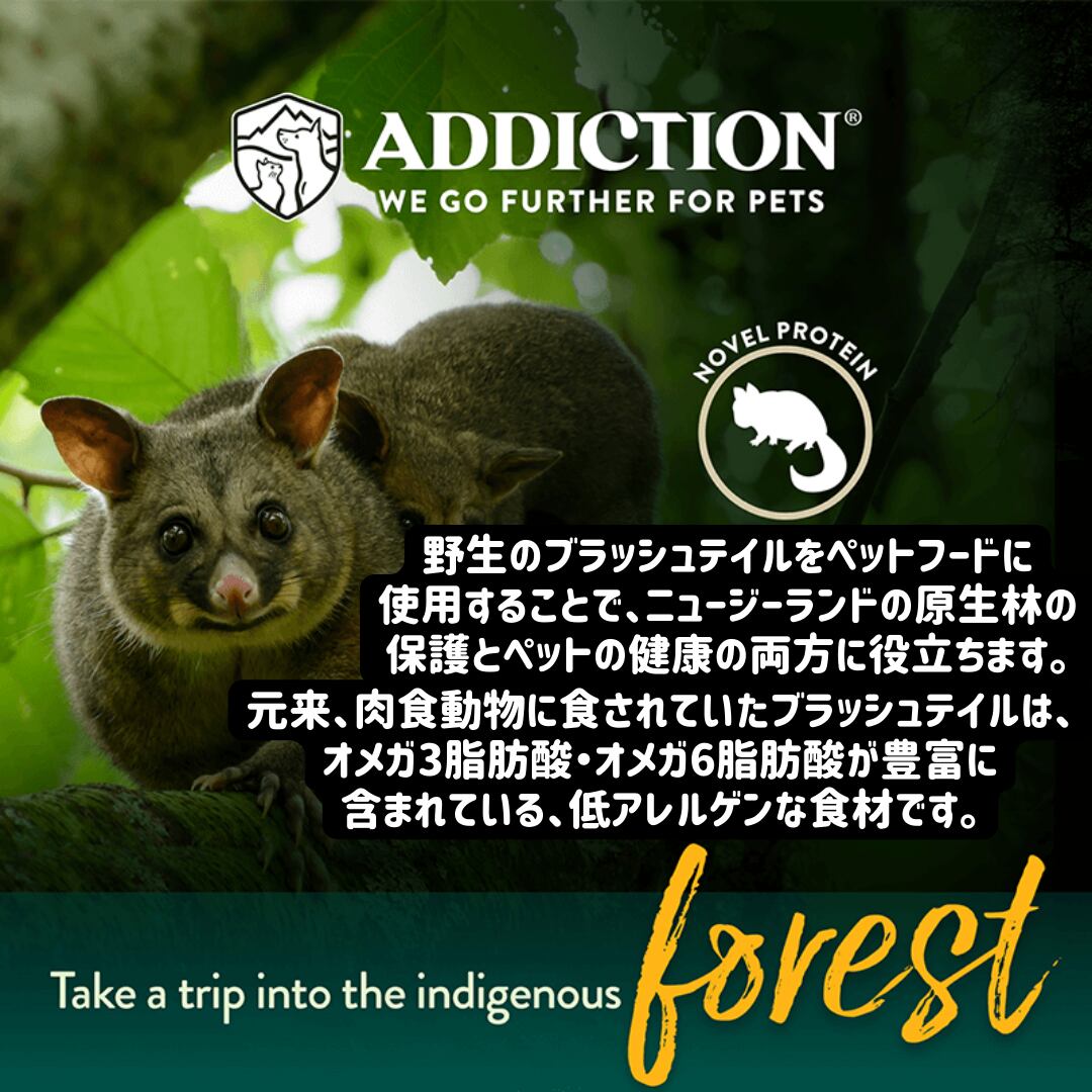ブラッシュテイル生肉、ポテト、ニンジン、フラックスシード、ココナッツオイル、タピオカ、パパイヤ、サンフラワーシード、ほうれん草、ブルーベリー、クランベリー、マンゴー、アップル、バジル、ローズマリー、タイム、ペパーミント、天然フレーバー、醸造用酵母、シーソルト、リン酸二カルシウム、塩化コリン、硫酸マグネシウム、ビタミンA、ビタミンD3、ビタミンE、硝酸チアミン、リボフラビン、パントテン酸カルシウム、ナイアシン、塩酸ピリドキシン、葉酸、ビタミンB12、硫酸第一鉄、硫酸銅、硫酸マンガン、硫酸亜鉛、ヨウ素酸カルシウム、亜セレン酸ナトリウム、硫酸コバルト、タウリン、緑茶エキス、ローズマリーエキス、スペアミントエキス、酸化防止剤(ミックストコフェロール)