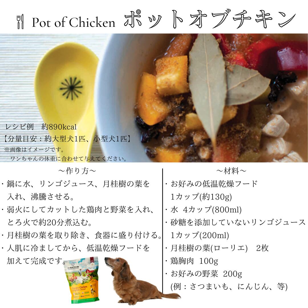 鶏生肉、オーツ麦、ポテト、ニンジン、フラックスシード、ココナッツオイル、パパイヤ、アプリコット、クランベリー、ブルーベリー、マンゴー、アップル、バジル、ローズマリー、タイム、ペパーミント、ほうれん草、天然フレーバー、タピオカ、醸造用酵母、シーソルト、硫酸マグネシウム、塩化コリン、ビタミンA、ビタミンD3、ビタミンE、硝酸チアミン、リボフラビン、パントテン酸カルシウム、ナイアシン、塩酸ピリドキシン、葉酸、ビタミンB12、硫酸第一鉄、硫酸銅、硫酸マンガン、硫酸亜鉛、ヨウ素酸カルシウム、亜セレン酸ナトリウム、硫酸コバルト、タウリン、緑茶エキス、ローズマリーエキス、スペアミントエキス、酸化防止剤(ミックストコフェロール)